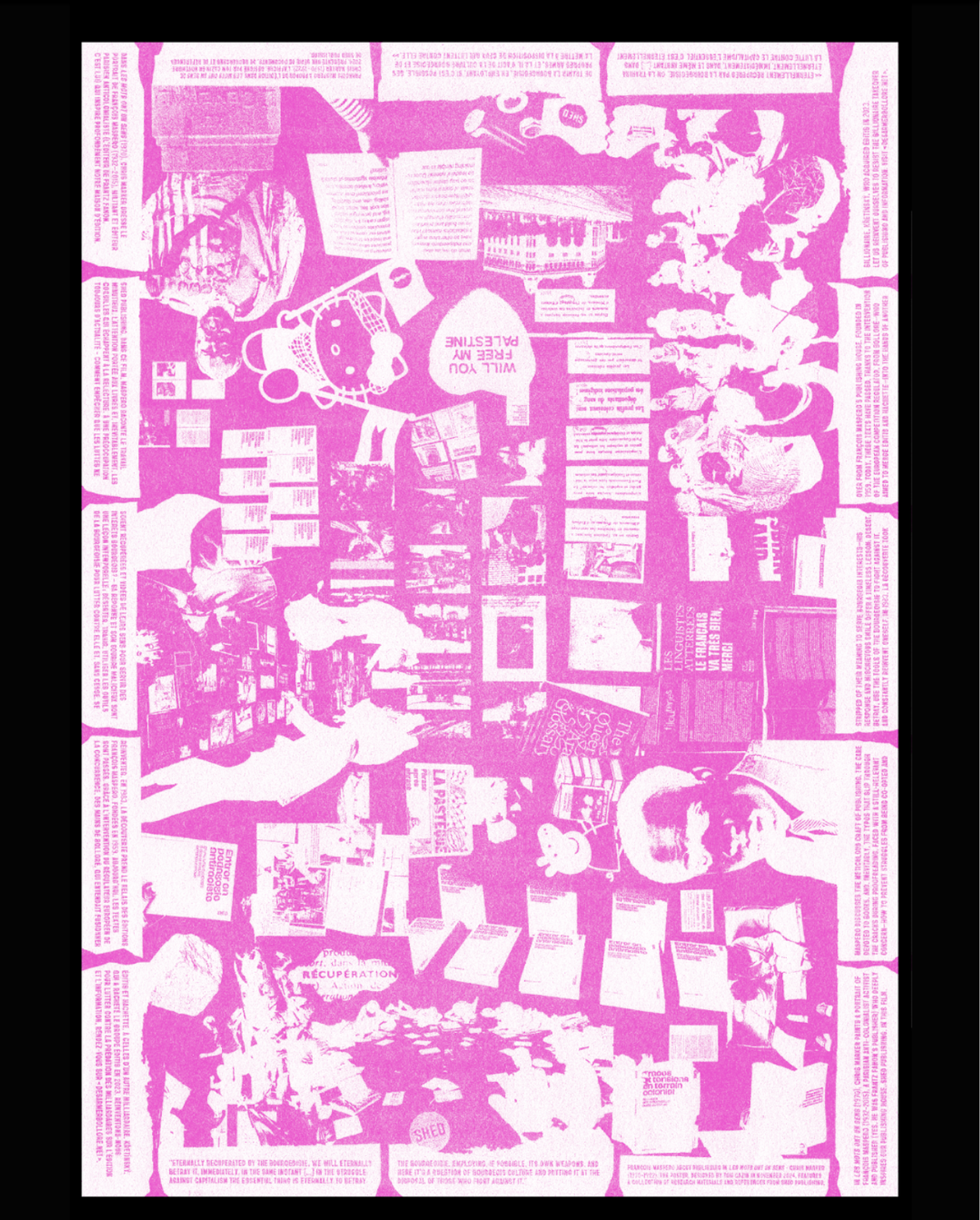 L’affiche, designée par Tom Cazin en novembre 2024, rend hommage à l’éditeur François Maspero et présente une série de documents, de recherches et de références de Shed publishing.